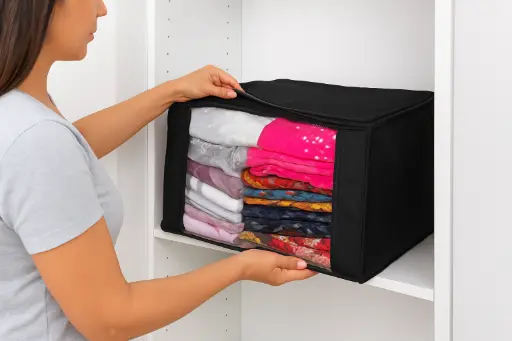 Large size cover (15 x 14 x 3 inches) with zip closure for saree bag and clothes organizer with window